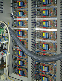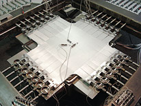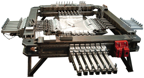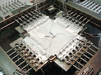 Testing of compound fibres, coated fabrics, films and high-quality textiles. In this application, materials undergo testing for stretch expansion properties using a bi-axle testing frame. One particularly important aspect is the distribution of tensile forces in order to achieve homogenous anisotropic tension levels. The amplifier, motor, gear and coil produce a tensile force of 20kN per actuator, equating to 140kN on each side. Acting as speed controllers, the amplifiers are underlying to the tensile force control.