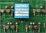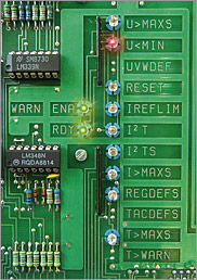 | The DC/DC converter supplies all 8 auxiliary supplies in the unit. Important from a safety point of view is the a high level of isolation voltage (3.8kV) between the auxiliary supplies, as well as the high level of operational reliability in the event of undervoltage. |