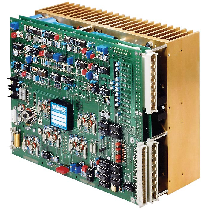 The V207 high-power amplifier series is a universally usable servo amplifier with extensive monitoring which can be specifically configured to customer needs. Clean DC voltage at the output is achieved by L/C low pass filtering in the output stage.